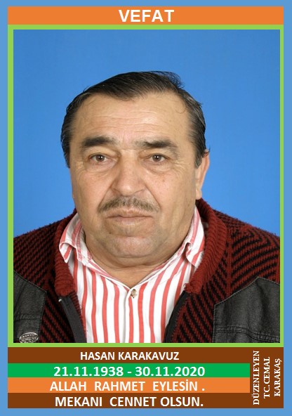 YENİCE YEŞİLKÖY NÜFUSUNA KAYITLI OLUP, YENİKÖY KARAKAVUZ KÜME EVLERİ NO:38’DE İKAMET EDEN MERHUM NAZİF ve MERHUME HATİCE OĞLU, FATMA KARAKAVUZ EŞİ, HASAN KARAKAVUZ (21.11.1938 DOĞUMLU) HAKKIN RAHMETİNE KAVUŞMUŞTUR. CENAZESİ  (01.12.2020 SALI GÜNÜ) KARAKAVUZ MERKEZ CAMİİNDE KILINACAK CENAZE NAMAZINDAN SONRA SON YOLCULUĞUNA UĞURLANACAKTIR. EŞİ FATMA KARAKAVUZ, ÇOCUKLARI RAMAZAN KARAKAVUZ, MERHUM ZAHİRE KARAKAVUZ, NEZAHAT ÇALIŞKAN, NEBAHAT ANGIN, HATİCE NADULCUK, ÇİĞDEM CANSIZ, SATİYE ABAY, FİLİZ ONUR, YETER AKBIYIK, DAMATLARI YUSUF ABAY, HAMZA CANSIZ, ERKAN NADULCUK, HASAN ONUR, BURHAN KARAKAVUZ, MUSTAFA AKBIYIK. ALLAH RAHMET EYLESİN. MEKANI CENNET OLSUN. GERİDE BIRAKTIĞI SEVENLERİNE VE AİLESİNE BAŞSAĞLIĞI VE SABIR DİLERİZ.