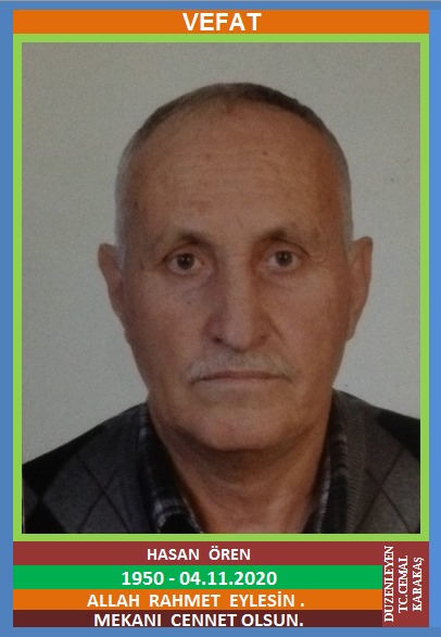 YENİCE ÖRENKÖY KÖYÜ NÜFUSUNA KAYITLI OLUP, ÖREN KÖYÜ MERKEZ MEVKİDE İKAMET EDEN MERHUM RAŞİT ve DURKADIN OĞLU, SAKİNE ÖREN EŞİ, KABAK HASAN LAKABI İLE BİLİNEN HASAN ÖREN (1950 DOĞUMLU) HAKKIN RAHMETİNE KAVUŞMUŞTUR. CENAZESİ  (05.11.2020 PERŞEMBE GÜNÜ) YENİCE ÖREN KÖYÜ MERKEZ KÖY KONAĞI ÖNÜNDE SAAT: 11.00’DE KILINACAK CENAZE NAMAZINDAN SONRA SON YOLCULUĞUNA UĞURLANACAKTIR. EŞİ SAKİNE ÖREN, ÇOCUKLARI YAŞAR ÖREN, TURGUT ÖREN, KARDEŞLERİ HÜSEYİN ÖREN, CEMİLE BAĞBAŞI, SEYFETTİN ÖREN, SABAHATTİN ÖREN, AYNUR ÇELEBİ ALLAH RAHMET EYLESİN. MEKANI CENNET OLSUN. GERİDE BIRAKTIĞI SEVENLERİNE VE AİLESİNE BAŞSAĞLIĞI VE SABIR DİLERİZ.