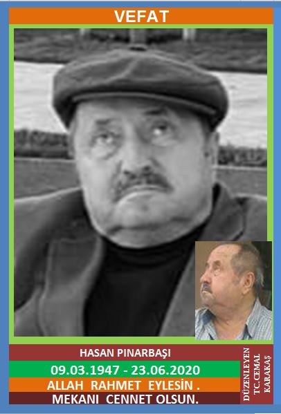 YENİCE HÜSEYİNBEYOĞLU KÖYÜ MERKEZ MAHALLESİ NÜFUSUNA KAYITLI OLUP, YENİCE MERKEZ MAHALLESİ İNÖNÜ SOKAK NO: 3/1’DE İKAMET EDEN İLÇEMİZİN İLK ESNAFLARINDAN YETİM HÜSNÜ ve HANİFE OĞLU, İLÇEMİZ ESNAFLARINDAN HASAN PINARBAŞI (09.03.1947 DOĞUMLU) HAKKIN RAHMETİNE KAVUŞMUŞTUR. CENAZESİ (24.06.2020 ÇARŞAMBA GÜNÜ) YENİCE MERKEZ MAHALLESİ MERKEZ CAMİİNDE ÖĞLE NAMAZINDAN SONRA KILINACAK CENAZE NAMAZINA MÜTEAKİP SON YOLCULUĞUNA UĞURLANACAKTIR. ÇOCUKLARI HAKAN PINARBAŞI, FATİH PINARBAŞI, GÖKHAN PINARBAŞI, KARDEŞLERİ NACİYE PEKPAK, MERHUM ŞADİ PINARBAŞI, MERHUM ADNAN PINARBAŞI, MERHUME ZEKİYE KURT. ALLAH RAHMET EYLESİN. MEKANI CENNET OLSUN. GERİDE BIRAKTIĞI SEVENLERİNE VE AİLESİNE BAŞSAĞLIĞI VE SABIR DİLERİZ.