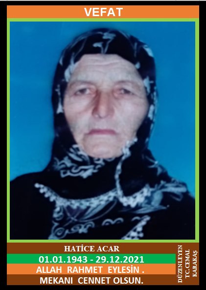 YENİCE KADIKÖY NÜFUSUNA KAYITLI OLUP, KADIKÖY MERKEZ KÜME EVLERİ NO:65/1’DE İKAMET EDEN MERHUM İBRAHİM ve MERHUME AZİZE KIZI, MERHUME SİYAMİ ACAR EŞİ, HATİCE ACAR (01.01.1943 DOĞUMLU) HAKKIN RAHMETİNE KAVUŞMUŞTUR. CENAZESİ (30.12.2021 PERŞEMBE GÜNÜ) KADIKÖY MERKEZ CAMİİNDE ÖĞLE NAMAZINA MÜTEAKİP KILINACAK CENAZE NAMAZINDAN SONRA SONRA SON YOLCULUĞUNA UĞURLANACAKTIR. EŞİ MERHUM SİYAMİ ACAR, ÇOCUKLARI MÜZEYYEN ÇOLAK, NEZAKET ACAR, DAMATLARI FAHRETTİN ÇOLAK, SİYAMİ ACAR. ALLAH RAHMET EYLESİN. MEKANI CENNET OLSUN. GERİDE BIRAKTIĞI SEVENLERİNE VE AİLESİNE BAŞSAĞLIĞI VE SABIR DİLERİZ.