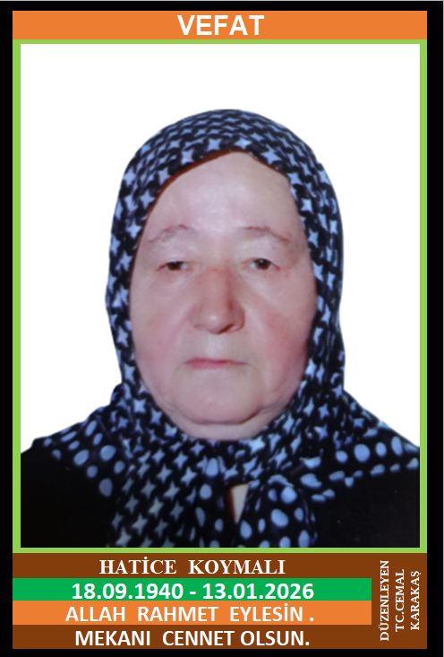 İLÇEMİZ BAĞBAŞI KÖYÜ NÜFUSUNA KAYITLI OLUP, İSMETPAŞA MAHALLESİ MAVİ SOKAK NO:7/1’DE İKAMET EDEN MERHUM ABDULLAH ve MERHUME AZİME KIZI, ALMANYA EMEKLİSİ DEMOKRAT PARTİ İLÇE BAŞKANI ADEM KOYMALI’NIN EŞİ, ÖNCEKİ DÖNEM ALMANYA YENİCELİLER DERNEK BAŞKAN CEVDET KOYMALI’NIN ANNESİ HATİCE KOYMALI (18.09.1940 DOĞUMLU) HAKKIN RAHMETİNE KAVUŞMUŞTUR. CENAZESİ (15.01.2026 PERŞEMBE GÜNÜ) ÖZAL MAHALLESİ CAMİİNDE İKİNDİ NAMAZINA MÜTEAKİP KILINACAK CENAZE NAMAZINDAN SONRA SON YOLCULUĞUNA UĞURLANACAKTIR. EŞİ ADEM KOYMALI, ÇOCUKLARI CEVDET KOYMALI, KERİM KOYMALI, YILDIRAY KOYMALI, GÜLHAN ERİŞOĞLU, AZİZE GÖKMEN, GELİNLERİ NURAY KOYMALI, HACER KOYMALI, ZABARİNA KOYMALI, DAMATLARI SAFFET ERİŞOĞLU, ORHAN GÖKMEN, KARDEŞLERİ MUZAFFER ALAZ, MUHİTTİN ALAZ, MUHAMMET ALAZ, MERHUM KEMAL ALAZ, MERHUME FATMA ALAZ. ALLAH RAHMET EYLESİN. MEKANI CENNET OLSUN. GERİDE BIRAKTIĞI SEVENLERİNE VE AİLESİNE BAŞSAĞLIĞI VE SABIR DİLERİZ.