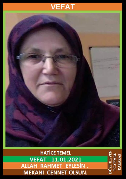 UZUN YILLAR YENİCE’MİZDE PİDECİ FEHMİ OLARAK ESNAFLIK YAPAN VE DAHA SONRA KARABÜK’E TAŞINARAK DEVAM EDEN MERHUM FEHMİ TEMEL’İN EŞİ HAKKIN RAHMETİNE KAVUŞMUŞTUR. CENAZESİ (11.01.2021 PAZARTESİ GÜNÜ) KARABÜK 5000 EVLER CUMHURİYET MAHALLESİ BİM YANINDAKİ YENİ CAMİDE KILINACAK CENAZE NAMAZINDAN SONRA SON YOLCULUĞUNA UĞURLANACAKTIR. ALLAH RAHMET EYLESİN. MEKANI CENNET OLSUN. GERİDE BIRAKTIĞI SEVENLERİNE VE AİLESİNE BAŞSAĞLIĞI VE SABIR DİLERİZ.