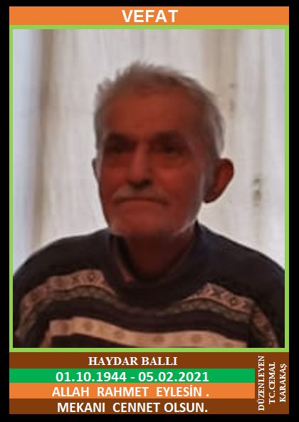 YENİCE GÖKBEL KÖYÜ HATİPOLU MAHALLESİ NÜFUSUNA KAYITLI OLUP, GÖKBEL KÖYÜ HATİPOĞLU MEVKİ NO: 1 ve ÖZAL MAHALLESİ’DE İKAMET EDEN MERHUM RIZA ve MERHUME SARE OĞLU, HANİFE BALLI EŞİ HAYDAR BALLI (01.10.1944 DOĞUMLU) HAKKIN RAHMETİNE KAVUŞMUŞTUR. CENAZESİ (05.02.2021 CUMA GÜNÜ) GÖKBEL KÖYÜ HAMİTOĞLU MAHALLESİ, CAMİİNDE SAAT: 13.30’DA KILINACAK CENAZE NAMAZINA MÜTEAKİP AİLE MEZARLIĞINA DEFNEDİLEREK SON YOLCULUĞUNA UĞURLANACAKTIR. EŞİ HANİFE BALLI, ÇOCUKLARI MÜZEYYEN KIRIŞ, NAZMİYE BALLI, NURDAN BALLI, NURAY GÜNEY, DAMATLARI FİKRET KIRIŞ, AYHAN BALLI, HALİL GÜNEY. ALLAH RAHMET EYLESİN. MEKANI CENNET OLSUN. GERİDE BIRAKTIĞI SEVENLERİNE VE AİLESİNE BAŞSAĞLIĞI VE SABIR DİLERİZ.
