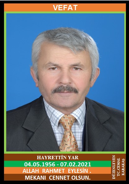 YENİCE HİSAR KÖYÜ NÜFUSUNA KAYITLI OLUP, YENİCE MERKEZ MAHALLESİ POLATKAN SOKAK NO: 5/3’DE İKAMET EDEN MERHUM MEHMET ve FERZANİYE OĞLU, SAKİNE YAR EŞİ HAYRETTİN YAR (04.05.1956 DOĞUMLU) HAKKIN RAHMETİNE KAVUŞMUŞTUR. CENAZESİ (08.02.2021 PAZARTESİ GÜNÜ) YENİCE MERKEZ CAMİİNDE SAAT: 11.00’DA KILINACAK CENAZE NAMAZINA MÜTEAKİP AİLE MEZARLIĞINA DEFNEDİLEREK SON YOLCULUĞUNA UĞURLANACAKTIR. EŞİ SAKİNE YAR, ÇOCUKLARI DURSUN YAR, NURTEN KIRIK, GÜLTEN KIRIK, DAMATLARI ÖZCAN KIRIK, ŞEFİK KIRIK. ALLAH RAHMET EYLESİN. MEKANI CENNET OLSUN. GERİDE BIRAKTIĞI SEVENLERİNE VE AİLESİNE BAŞSAĞLIĞI VE SABIR DİLERİZ.