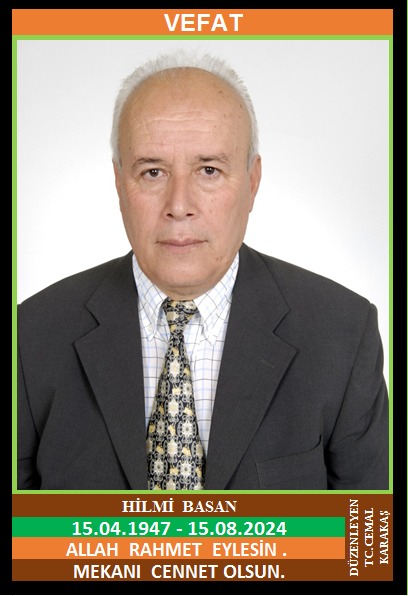 İLÇEMİZ İSMETPAŞA MAHALLESİ NÜFUSUNA KAYITLI OLUP, İSMETPAŞA MAHALLESİ ÇANKAYA CADDESİ NO:19’DA İKAMET EDEN MERHUM TEVFİK ve MERHUME HATİCE OĞLU, ZELİHA BASAN EŞİ, YENİCE ESNAFLARINDAN KAHVECİ TEVFİK MEFTUN BASAN ve MURAT BASAN’IN BABASI, ESKİ KAHVECİ (15.04.1947 DOĞUMLU) HAKKIN RAHMETİNE KAVUŞMUŞTUR. CENAZESİ (16.08.2024 CUMA GÜNÜ) İSMETPAŞA MAHALLESİ MERKEZ CAMİİNDE CUMA NAMAZINA MÜTEAKİP KILINACAK CENAZE NAMAZINDAN SONRA SON YOLCULUĞUNA UĞURLANACAKTIR. EŞİ ZELİHA BASAN ÇOCUKLARI TEVFİK MEFTUN BASAN, MURAT BASAN, SELMA SELGEÇTİ, SEVİLAY YILMAZ, SEVGİ ÖZGÜN, DAMATLARI İSMETPAŞA MAHALLESİ MERKEZ CAMİ HOCASI SEBAHATTİN SELGEÇTİ, KARABÜK ESNAFLARINDAN AŞKIN YILMAZ, BİLGİN ÖZGÜN. ALLAH RAHMET EYLESİN. MEKANI CENNET OLSUN. GERİDE BIRAKTIĞI SEVENLERİNE VE AİLESİNE BAŞSAĞLIĞI VE SABIRL DİLERİZ.