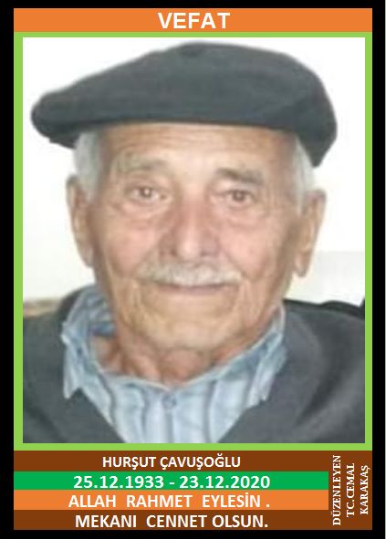 YENİCE KAYAARKASI KÖYÜ NÜFUSUNA KAYITLI OLUP, KAYAARKASI KÖYÜ ÖMEROĞLU KÜME EVLERİ NO: 28’DE İKAMET EDEN MERHUM YAHYA ve MERHUME AZİME OĞLU, ZAHİRE ÇAVUŞOĞLU EŞİ, HURŞUT ÇAVUŞOĞLU (25.12.1933 DOĞUMLU) HAKKIN RAHMETİNE KAVUŞMUŞTUR. CENAZESİ (23.12.2020 ÇARŞAMBA GÜNÜ) YENİCE ATATÜRK MAHALLESİ NİŞANTAŞI CAMİİNDE SAAT:11.00 ve AKABİNDE KAYAARKASI KÖYÜ ÖMEROĞLU MAHALLESİ CAMİİNDE KILINACAK CENAZE NAMAZINDAN SONRA SON YOLCULUĞUNA UĞURLANACAKTIR. EŞİ ZAHİRE ÇAVUŞOĞLU, ÇOCUKLARI MERHUM YAHYA ÇAVUŞOĞLU, MERHUM TUNA ÇAVUŞOĞL, ORMAN İŞLETMESİ EMEKLİSİ TUNAY (TUNCAY) ÇAVUŞOĞLU, SUNA ÇALIŞ, SEVGİ ESEN, DAMATLARI MERHUM RAFET ÇALIŞ, KADİR ESEN. ALLAH RAHMET EYLESİN. MEKANI CENNET OLSUN. GERİDE BIRAKTIĞI SEVENLERİNE VE AİLESİNE BAŞSAĞLIĞI VE SABIR DİLERİZ.