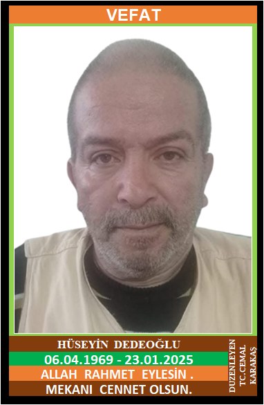 İLÇEMİZ ÇAKILLAR KÖYÜ NÜFUSUNA KAYITLI OLUP, ÇAKILLAR KÖYÜ MERKEZ KÜME EVLERİ NO: 34’DE İKAMET EDEN MERHUM HÜSEYİN ve MERHUME HATİCE OĞLU, NARKADIN DEDEOĞLU EŞİ, HÜSEYİN DEDEOĞLU (06.04.1969 DOĞUMLU) HAKKIN RAHMETİNE KAVUŞMUŞTUR. CENAZESİ (23.01.2025 PERŞEMBE GÜNÜ) YORTAN BELDESİ MERKEZ CAMİİNDE İKİNDİ NAMAZINA MÜTEAKİP KILINACAK CENAZE NAMAZINDAN SONRA SON YOLCULUĞUNA UĞURLANACAKTIR. EŞİ NARKADIN DEDEOĞLU, ÇOCUKLARI DOĞUŞ DEDEOĞLU, DERYA DEDEOĞLU, DUYGU DOĞAN, DAMADI MURAT DOĞAN, KARDEŞLERİ MEHMET DEDEOĞLU, CEMAL DEDEOĞLU, GÜLİZAR ÇENGEL. ALLAH RAHMET EYLESİN. MEKANI CENNET OLSUN. GERİDE BIRAKTIĞI SEVENLERİNE VE AİLESİNE BAŞSAĞLIĞI VE SABIR DİLERİZ.