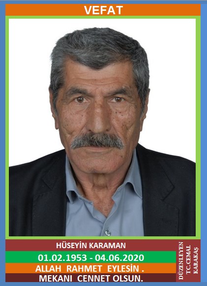 YENİCE DEREBAŞI KÖYÜ NÜFUSUNA KAYITLI OLUP, DEREBAŞI KÖYÜ KARAMANLAR KÜME EVLERİ NO: 55’DE İKAMET EDEN MERHUM AHMET ve FATMA OĞLU, NERMİN KARAMAN EŞİ, TEKEREK LAKABI İLE BİLİNEN, ZONGULDAK BELEDİYESİ EMEKLİSİ HÜSEYİN KARAMAN (01.02.1953 DOĞUMLU) HAKKIN RAHMETİNE KAVUŞMUŞTUR. CENAZESİ  (05.06.2020 CUMA GÜNÜ) DEREBAŞI KÖYÜ KARAMANLAR CAMİİNDE CUMA NAMAZINDAN ÖNCE SAAT : 11:30’DA KILINACAK CENAZE NAMAZINA MÜTEAKİP  SON YOLCULUĞUNA UĞURLANACAKTIR. EŞİ NERMİN KARAMAN, ÇOCUKLARI AHMET KARAMAN, FİKRET KARAMAN, ŞENGÜL CEBECİ, HAYRİYE KARAMAN, DAMATLARI RIFAT CEBECİ, ABDULLAH KARAMAN. ALLAH RAHMET EYLESİN. MEKANI CENNET OLSUN. GERİDE BIRAKTIĞI SEVENLERİNE VE AİLESİNE BAŞSAĞLIĞI VE SABIR DİLERİZ.