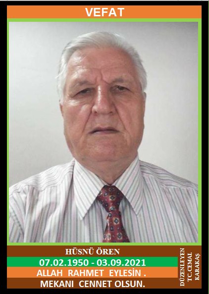YENİCE TIR KÖYÜ RECEPBEYLER MAHALLESİ NÜFUSUNA KAYITLI OLUP, YENİCE FATİH MAHALLESİ MÜŞGEN SOKAK NO:33/2’DE İKAMET EDEN MERHUM ALİ ve MERHUME HATİCE OĞLU, MERHUME BAHTİYAR ÖREN EŞİ, ORMAN MUHAFAZA MEMURU EMEKLİSİ HÜSNÜ ÖREN (07.02.1950 DOĞUMLU) HAKKIN RAHMETİNE KAVUŞMUŞTUR.CENAZESİ  (03.09.2021 CUMA GÜNÜ) YENİCE  MERKEZ CAMİİNDE CUMA NAMAZINA MÜTEAKİP KILINACAK CENAZE NAMAZINDAN SONRA SON YOLCULUĞUNA UĞURLANACAKTIR. EŞİ MERHUME BAHTİYAR ÖREN, ÇOCUKLARI YILMAZ ÖREN, YILDIRAY ÖREN, NEBAHAT AKPINAR, SEBAHAT EMDİ, NEZAHAT ÖREN, DAMATLARI MUSTAFA AKPINAR,  NAİM EMDİ, HASAN ÖREN. ALLAH RAHMET EYLESİN. MEKANI CENNET OLSUN. GERİDE BIRAKTIĞI SEVENLERİNE VE AİLESİNE BAŞSAĞLIĞI VE SABIR DİLERİZ.