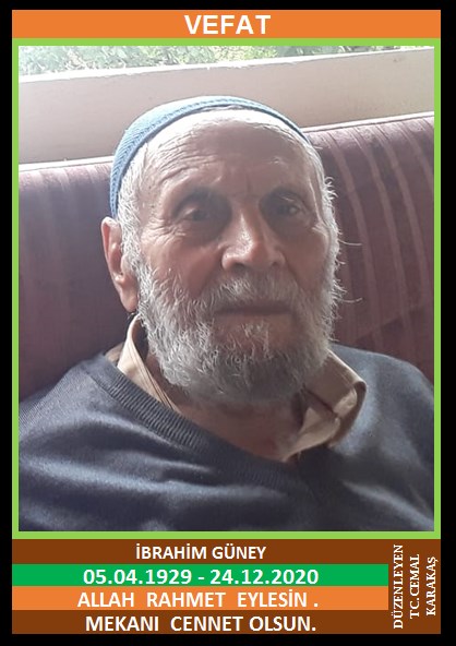 YENİCE NODULLAR KÖYÜ NÜFUSUNA KAYITLI OLUP, YENİCE ATATÜRK MAHALLESİ BEŞEVLİLER KÜME EVLERİ NO: 9’DA İKAMET EDEN MERHUM İSMAİL ve MERHUME AYŞE OĞLU, MERHUME ZÜHRİYE GÜNEY EŞİ, NODULLAR KÖYÜ CAMİİ İMAMI DURSUN GÜNEY’İN BABASI, İBRAHİM GÜNEY (05.04.1929 DOĞUMLU) HAKKIN RAHMETİNE KAVUŞMUŞTUR. CENAZESİ (24.12.2020 PERŞEMBE GÜNÜ) YENİCE ATATÜRK MAHALLESİ MEVLANA CAMİİNDEKILINACAK CENAZE NAMAZINDAN SONRA SON YOLCULUĞUNA UĞURLANACAKTIR. EŞİ MERHUME ZÜHRİYE GÜNEY, ÇOCUKLARI MERHUM İSMAİL GÜNEY, NODULLAR KÖYÜ CAMİİ İMAMI DURSUN GÜNEY, FATMA GÜNEY, HANİFE ÇÖTÜR, DAMATLARI HAŞİM GÜNEY, ŞEVKİ ÇÖTÜR. ALLAH RAHMET EYLESİN. MEKANI CENNET OLSUN. GERİDE BIRAKTIĞI SEVENLERİNE VE AİLESİNE BAŞSAĞLIĞI VE SABIR DİLERİZ.