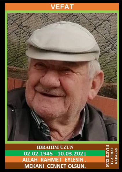 YENİCE ÇAKILLAR KÖYÜ UZUNLAR MAHALLESİ NÜFUSUNA KAYITLI OLUP,  ÇAKILLAR KÖYÜ UZUNLAR KÜME EVLERİ NO:19’DA İKAMET EDEN MERHUM ABDURRAHMAN ve MERHUME DÖNDÜ OĞLU, MERHUME FERDANE UZUN EŞİ, MÜDÜR’A LAKABI İLE BİLİNEN, İBRAHİM UZUN (02.02.1945 DOĞUMLU) HAKKIN RAHMETİNE KAVUŞMUŞTUR. CENAZESİ (10.03.2021 PERŞEMBE GÜNÜ) YORTAN’DA ÖĞLE NAMAZI SONRASI ve ÇAKILLAR KÖYÜ UZUNLAR CAMİİNDE SAAT: 15.00’DA KILINACAK CENAZE NAMAZINA MÜTEAKİP AİLE MEZARLIĞINA DEFNEDİLEREK SON YOLCULUĞUNA UĞURLANACAKTIR. EŞİ FERDANE UZUN, ÇOCUKLARI İSA UZUN, RAMAZAN UZUN, FATİME UZUN, DAMADI HACI RİFAT UZUN. ALLAH RAHMET EYLESİN. MEKANI CENNET OLSUN. GERİDE BIRAKTIĞI SEVENLERİNE VE AİLESİNE BAŞSAĞLIĞI VE SABIR DİLERİZ.