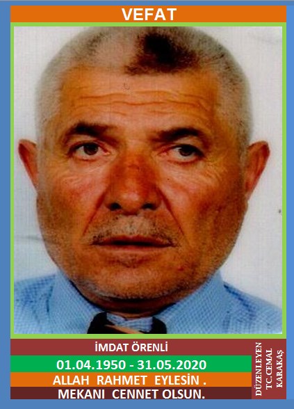 YENİCE TIR KÖYÜ NÜFUSUNA KAYITLI OLUP, TIR KÖYÜ CAMİYANI MEVKİİ NO: 94/2’DE İKAMET EDEN MERHUM MUSTAFA ve AZİZE OĞLU, MERHUM HANİFE ÖRENLİ, BAHTİYAR ÖRENLİ EŞİ, KAMYONCU ESNAFLARINDAN İMDAT ÖRENLİ (01.04.1950 DOĞUMLU) HAKKIN RAHMETİNE KAVUŞMUŞTUR. CENAZESİ (01.06.2020 PAZARTESİ GÜNÜ) YENİCE MERKEZ CAMİİNDE ÖĞLE NAMAZINDAN ONCESİ SAAT : 12:00’DA KILINACAK CENAZE NAMAZINA MÜTEAKİP SON YOLCULUĞUNA UĞURLANACAKTIR. EŞİ MERHUM HANİFE ÖRENLİ, BAHTİYAR ÖRENLİ, ÇOCUKLARI UĞUR ÖRENLİ, İMRAN KARAKAŞ, VİCDAN ÖRENLİ, HANİFE ÇALIŞKAN, GÜLBEYAZ ÖZÇELEBİ, NAİLE İNCEBACAK, DAMATLARI YILMAZ KARAKAŞ, İRFAN ÖRENLİ, MUHAMMET ÇALIŞKAN, SABRİ İNCEBACAK, EMRAH ÖZÇELEBİ. ALLAH RAHMET EYLESİN. MEKANI CENNET OLSUN. GERİDE BIRAKTIĞI SEVENLERİNE VE AİLESİNE BAŞSAĞLIĞI VE SABIR DİLERİZ.