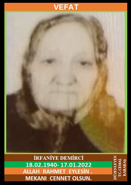 YENİCE KUZDAĞ KÖYÜ NÜFUSUNA KAYITLI OLUP, KUZDAĞ KÖYÜ TUNUSLAR MEVKİ NO:7/A’DA İKAMET EDEN HASAN ve MERHUME ASİYE KIZI, MERHUM SİYAMİ DEMİRCİ EŞİ, YENİCE TERZİ ESNAFIMIZDAN İLYAS TEFENLİ’NİN KAYINVADESİ, İRFANİYE DEMİRCİ (18.02.1940 DOĞUMLU) HAKKIN RAHMETİNE KAVUŞMUŞTUR. CENAZESİ (18.01.2022 SALI GÜNÜ) KUZDAĞ KÖYÜ MERKEZ CAMİİNDE ÖĞLE NAMAZINA MÜTEAKİP KILINACAK CENAZE NAMAZINDAN SONRA SON YOLCULUĞUNA UĞURLANACAKTIR. EŞİ MERHUM SİYAMİ DEMİRCİ, ÇOCUKLARI RAMAZAN DEMİRCİ, TURAN DEMİRCİ, FATMA DERELİ, SAKİNE GÜNEY, HANİFE (NACİYE) TEFENLİ, DAMATLARI RAMAZAN DERELİ, EMEKLİ EMNİYET BEKÇİSİ MEHMET GÜNEY, İLYAS TEFENLİ. ALLAH RAHMET EYLESİN. MEKANI CENNET OLSUN. GERİDE BIRAKTIĞI SEVENLERİNE VE AİLESİNE BAŞSAĞLIĞI VE SABIR DİLERİZ.