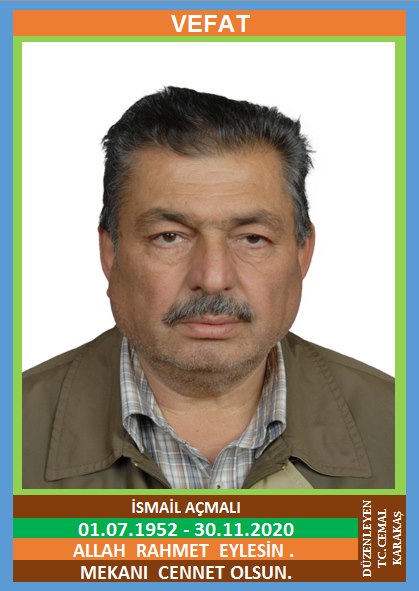 YENİCE YENİKÖY NÜFUSUNA KAYITLI OLUP, YENİKÖY ÇAY MEVKİ NO:46’DA İKAMET EDEN MERHUM MEHMET ve MERHUME DURKADIN OĞLU, ÜLVİYE AÇMALI EŞİ, İSMAİL AÇMALI (01.07.1952 DOĞUMLU) HAKKIN RAHMETİNE KAVUŞMUŞTUR. CENAZESİ (30.11.2020 PAZARTESİ GÜNÜ) YENİKÖY MERKEZ CAMİİNDE KILINACAK CENAZE NAMAZINDAN SONRA SON YOLCULUĞUNA UĞURLANACAKTIR. EŞİ ÜLVİYE AÇMALI, ÇOCUKLARI EMRAH AÇMALI, BİAL AÇMALI, KARDEŞİ RIZA AÇMALI. ALLAH RAHMET EYLESİN. MEKANI CENNET OLSUN. GERİDE BIRAKTIĞI SEVENLERİNE VE AİLESİNE BAŞSAĞLIĞI VE SABIR DİLERİZ.