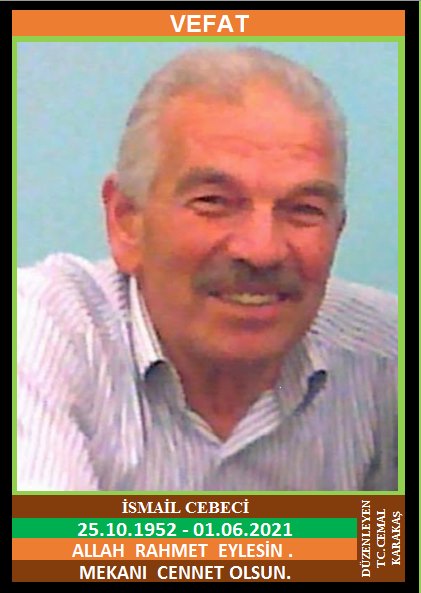 YENİCE ÇAMLIKÖY NÜFUSUNA KAYITLI OLUP, KARABÜK’DE İKAMET EDEN MERHUM TEVFİK ve MERHUME KEZBAN OĞLU, FATMA CEBECİ EŞİ TOPÇU İSMAİL OLARAK BİLİNEN İSMAİL CEBECİ (25.10.1952 DOĞUMLU) HAKKIN RAHMETİNE KAVUŞMUŞTUR. CENAZESİ (01.06.2021 SALI GÜNÜ) YENİCE ÇAMLIKÖY MERKEZ CAMİİNDE İKİNDİ NAMAZI SONRASI KILINACAK CENAZE NAMAZI SONRASI SON YOLCULUĞUNA UĞURLANACAKTIR. EŞİ EŞİ FATMA CEBECİ, ÇOCUKLARI YELİZ CEBECİ, FİLİZ GÜLAY, YASİN CEBECİ, YASEMİN, DAMADI ALİ GÜLAY. ALLAH RAHMET EYLESİN. MEKANI CENNET OLSUN. GERİDE BIRAKTIĞI SEVENLERİNE VE AİLESİNE BAŞSAĞLIĞI VE SABIR DİLERİZ.