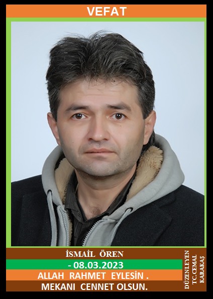 İLÇEMİZ TIR KÖYÜ RECEPBEYLER MAHALLESİ NÜFUSUNA KAYITLI OLUP, ALMANYA’DA İKAMET EDEN MERHUM SADULLAH ve MERHUME DURKADIN OĞLU, MERYEM ÖREN EŞİ, İSMAİL ÖREN (… DOĞUMLU) HAKKIN RAHMETİNE KAVUŞMUŞTUR. CENAZESİ (09.03.2023 PERŞEMBE GÜNÜ) YENİCE MERKEZ CAMİİNDE İKİNDİ NAMAZINA MÜTEAKİP KILINACAK CENAZE NAMAZINDAN SONRA SON YOLCULUĞUNA UĞURLANACAKTIR. EŞİ MERYEM ÖREN, ÇOCUKLARI VEYSEL ÖREN, ENVER ÖREN, EMRE ÖREN, EMİN ÖREN, ENES ÖREN. ALLAH RAHMET EYLESİN. MEKANI CENNET OLSUN. GERİDE BIRAKTIĞI SEVENLERİNE VE AİLESİNE BAŞSAĞLIĞI VE SABIR DİLERİZ.