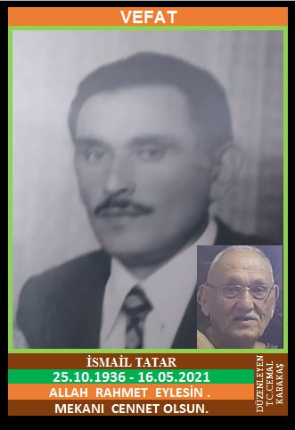 YENİCE DEREBAŞI KÖYÜ TATARLAR MAHALLESİ NÜFUSUNA KAYITLI OLUP, DEREBAŞI KÖYÜ TATARLAR KÜME EVLERİ NO:26 ve ZONGULDAK İLİNDE İKAMET EDEN MERHUM HASAN ve MERHUME HATİCE OĞLU, MERHUME HATİCE TATAR EŞİ, ESKİ DEREBAŞI KÖYÜ MUHTARI OSMAN KANCA’NIN KAYINBABASI, KİBAR İSMAİL OLARAK BİLİNEN İSMAİL TATAR (25.10.1936 DOĞUMLU) HAKKIN RAHMETİNE KAVUŞMUŞTUR. CENAZESİ (16.05.2021 PAZAR GÜNÜ) DEREBAŞI KÖYÜ TATARLAR MAHALLESİ CAMİİNDE ÖĞLE NAMAZI SONRASI KILINACAK CENAZE NAMAZINDAN SONRA SON YOLCULUĞUNA UĞURLANACAKTIR. EŞİ MERHUME HATİCE TATAR, ÇOCUKLARI YILMAZ TATAR, RECEP TATAR, AYSEL KANCA, DAMADI ESKİ DEREBAŞI KÖYÜ MUHTARI OSMAN KANCA, KARDEŞLERİ MUSTAFA TATAR, NECATİ TATAR, MERHUM AZİZ TATAR, MERHUM HÜSEYİN TATAR, MERHUM HASAN TATAR, MERHUME KEZBAN KAYABAŞI, MERHUME AYŞE ÇAKIR, TORUNLARI TTK MADEN İŞÇİSİ İSLAM KANCA, ESER TATAR, SEZER TATAR. ALLAH RAHMET EYLESİN. MEKANI CENNET OLSUN. GERİDE BIRAKTIĞI SEVENLERİNE VE AİLESİNE BAŞSAĞLIĞI VE SABIR DİLERİZ.