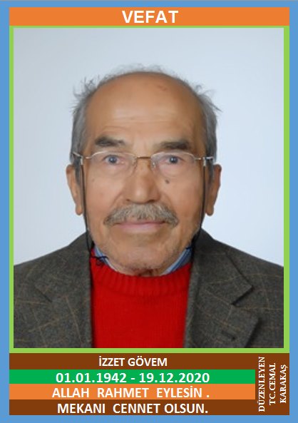 YENİCE ATATÜRK MAHALLESİ NÜFUSUNA KAYITLI OLUP, ATATÜRK MAHALLESİ ZÜBEYDE HANIM BULVARI NO: 75/B’DE İKAMET EDEN MERHUM TEVFİK ve MERHUME ZEYNEP OĞLU, HAYRİYE GÖVEM EŞİ, MERHUM TEK EMEKLİSİ YÜKSEL GÖVEM’İN BABASI, İZZET GÖVEM (01.01.1942 DOĞUMLU) HAKKIN RAHMETİNE KAVUŞMUŞTUR. CENAZESİ (19.12.2020 CUMARTESİ GÜNÜ) ATATÜRK MAHALLESİ MERKEZ CAMİİNDE SAAT:13.00’DA KILINACAK CENAZE NAMAZINDAN SONRA SON YOLCULUĞUNA UĞURLANACAKTIR. EŞİ HAYRİYE GÖVEM, ÇOCUKLARI MERHUM TEK EMEKLİSİ YÜKSEL GÖVEM, VEYSEL GÖVEM, BİRSEL ÇAYLI, AYTEN GÖVEM, DAMADI İLYAS ÇAYLI, KARDEŞLERİ MERHUM MEHMET GÖVEM, SİYAMİ GÖVEM, SAKİNE GÜVEN, MERHUM EMİR ÇENGEL, MERHUM AKİF GÖVEM. ALLAH RAHMET EYLESİN. MEKANI CENNET OLSUN. GERİDE BIRAKTIĞI SEVENLERİNE VE AİLESİNE BAŞSAĞLIĞI VE SABIR DİLERİZ.