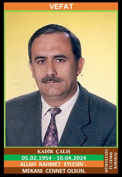 İLÇEMİZ KAYAARKASI KÖYÜ NÜFUSUNA KAYITLI OLUP, KAYAARKASI KÖYÜ HALAMANOĞLU KÜME EVLERİ NO:9’DA İKAMET EDEN MERHUM MUSTAFA ve MERHUME MERHUME FEDİME OĞLU, HURİYE ÇALIŞ EŞİ, KAYAARKASI KÖYÜ MUHTARI SİNAN ÇALIŞ’IN BABASI, ESKİ YENİCE KAYMAKAMLIĞI YAZI İŞLER MÜDÜRÜ KADİR ÇALIŞ (05.02.1954 DOĞUMLU) HAKKIN RAHMETİNE KAVUŞMUŞTUR. CENAZESİ (10.04.2024 ÇARŞAMBA GÜNÜ) KAYAARKASI KÖYÜ HALAMANOĞLU MAHALLESİ CAMİİNDE ÖĞLE NAMAZINA MÜTEAKİP KILINACAK CENAZE NAMAZINDAN SONRA SON YOLCULUĞUNA UĞURLANACAKTIR. EŞİ HURİYE ÇALIŞ, ÇOCUKLARI SİNAN ÇALIŞ, SAKİNE ÇALIŞKAN, MERHUME KEZBAN ÇALIŞ, DAMADI MUSTAFA ÇALIŞKAN. KARDEŞLERİ MERHUM HACI OSMAN ÇALIŞ, HACI RASİM ÇALIŞ, ŞENOL ÇALIŞ, KEZBAN DEMİR. ALLAH RAHMET EYLESİN. MEKANI CENNET OLSUN. GERİDE BIRAKTIĞI SEVENLERİNE VE AİLESİNE BAŞSAĞLIĞI VE SABIR DİLERİZ.