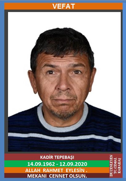 YENİCE DEREBAŞI KÖYÜ NÜFUSUNA KAYITLI OLUP, YENİCE ATATÜRK MAHALLESİ ATAKAN SOKAK NO:6/5’DE İKAMET EDEN HAKKI ve DURDU OĞLU, NEZAHAT TEPEBAŞI EŞİ KADİR TEPEBAŞI (14.09.1962 DOĞUMLU) HAKKIN RAHMETİNE KAVUŞMUŞTUR. CENAZESİ (13.09.2020 PAZAR GÜNÜ) ATATÜRK MAHALLESİ MERKEZ CAMİİNDE SAAT : 14 /00’DA KILINACAK CENAZE NAMAZINDAN SONRA SON YOLCULUĞUNA UĞURLANACAKTIR. BABASI HAKKI TEPEBAŞI, ANNESİ DURDU TEPEBAŞI, EŞİ NEZAHAT TEPEBAŞI, ÇOCUKLARI ORKUN TEPEBAŞI, TUĞÇE TEPEBAŞI, KARDEŞLERİ RAMAZAN TEPEBAŞI, KEMAL TEPEBAŞI, KAYINPEDERİ ALİ RIZA KÖKÇÜ, KAYINVADESİ KEZBAN KÖKÇÜ. ALLAH RAHMET EYLESİN. MEKANI CENNET OLSUN. GERİDE BIRAKTIĞI SEVENLERİNE VE AİLESİNE BAŞSAĞLIĞI VE SABIR DİLERİZ.