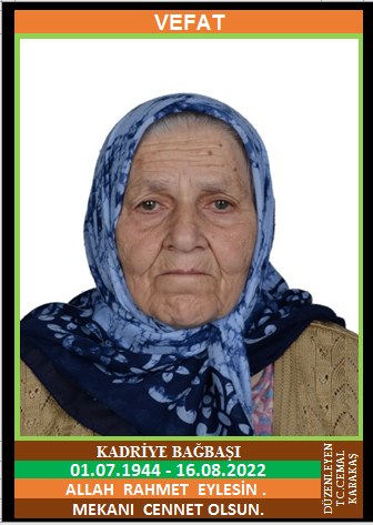 YENİCE BAĞBAŞI KÖYÜ NÜFUSUNA KAYITLI OLUP, ÇELTİK KÖYÜ DERE KÜME EVLERİ NO: 4/1 ve ALMANYA’DA İKAMET EDEN MERHUM ALİ ve MERHUME ARİFE KIZI, DURSUN BAĞBAŞI EŞİ, KADRİYE BAĞBAŞI (01.07.1944 DOĞUMLU) HAKKIN RAHMETİNE KAVUŞMUŞTUR. EŞİ DURSUN BAĞBAŞI, ÇOCUKLARI, HAKKI BAĞBAŞI, ALLAH RAHMET EYLESİN. MEKANI CENNET OLSUN. GERİDE BIRAKTIĞI SEVENLERİNE VE AİLESİNE BAŞSAĞLIĞI VE SABIR DİLERİZ.