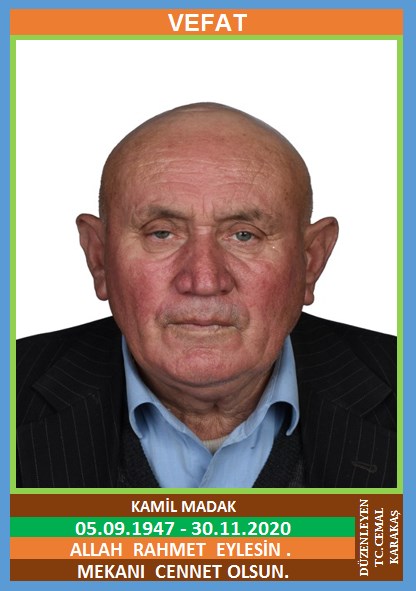 YENİCE GÜNEY (TIR) NÜFUSUNA KAYITLI OLUP, TIR KÖYÜ YENİ KÜME EVLERİ NO:36’DA İKAMET EDEN MERHUM RIFAT ve MERHUME DURKADIN OĞLU, SAFİYE MADAK EŞİ, YORÜS EMEKLİSİ KAMİL MADAK (05.09.1947 DOĞUMLU) HAKKIN RAHMETİNE KAVUŞMUŞTUR. CENAZESİ (01.12.2020 SALI GÜNÜ) YENİCE TİR KÖYÜ GÜNEY İLKÖĞRETİM OKULU ÖNÜNDA SAAT: 11.00’DA KILINACAK CENAZE NAMAZINDAN SONRA SON YOLCULUĞUNA UĞURLANACAKTIR. EŞİ SAFİYE MADAK, ÇOCUKLARI DURSUN MADAK, EROL MADAK, ŞENOL MADAK, NAFİYE AYAN, DAMADI ŞEVKET AYAN. ALLAH RAHMET EYLESİN. MEKANI CENNET OLSUN. GERİDE BIRAKTIĞI SEVENLERİNE VE AİLESİNE BAŞSAĞLIĞI VE SABIR DİLERİZ.
