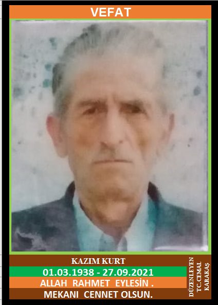 YENİCE DEĞİRMENYANI KÖYÜ ERFEYLİ MAHALLESİ NÜFUSUNA KAYITLI OLUP, DEĞİRMENYANI KÖYÜ ERFEYLİ KÜME EVLERİ NO: 84/1’DE İKAMET EDEN MERHUM İBRAHİM ve MERHUME HANİFE OĞLU, FATİME KURT EŞİ, DEĞİRMENYANI KÖYÜ MUHTARI İHSAN KURT’UN KAYINBABASI, KAZIM KURT (01.03.1938 DOĞUMLU) HAKKIN RAHMETİNE KAVUŞMUŞTUR. CENAZESİ (28.09.2021 SALI GÜNÜ) YENİCE ŞİRİNKÖY KÖYÜ MERKEZ CAMİİNDE ÖĞLE NAMAZINA MÜTEAKİP KILINACAK CENAZE NAMAZINDAN SONRA SON YOLCULUĞUNA UĞURLANACAKTIR. EŞİ FATİME KURT, ÇOCUKLARI MEHMET KURT, ERGİN KURT, HALİME BOSTANCI, ŞERİFE DEDEOĞLU, HAFİZE DEDEOĞLU, AYSUN KURT, FATMA KELEŞ, NAZİKER ÇAKIR, DAMADI İHSAN KURT, MERHUM AKİF BOTANCI, CEMAL DEDEOĞLU, AHMET DEDEOĞLU, DURSUN KELEŞ, MEHMET ÇAKIR. ALLAH RAHMET EYLESİN. MEKANI CENNET OLSUN. GERİDE BIRAKTIĞI SEVENLERİNE VE AİLESİNE BAŞSAĞLIĞI VE SABIR DİLERİZ.