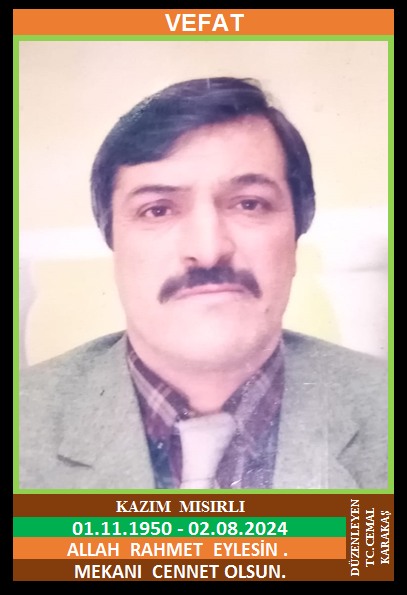 İLÇEMİZ KALAYCILAR MAHALLESİ NÜFUSUNA KAYITLI OLUP, KALAYCILAR MAHALLESİ ERGENEKON SOKAK NO:14/2’DE İKAMET EDEN MACAR LAKABI İLE BİLİNEN MERHUM OSMAN ve MERHUME RABİA OĞLU, MERHUME HAYRİYE MISIRLI EŞİ, MADEN EMEKLİSİ KAZIM MISIRLI (01.11.1950 DOĞUMLU) HAKKIN RAHMETİNE KAVUŞMUŞTUR. CENAZESİ  (03.08.2024 CUMARTESİ GÜNÜ) KALAYCILAR MAHALLESİ MERKEZ CAMİİNDE ÖĞLE NAMAZINA MÜTEAKİP KILINACAK CENAZE NAMAZINDAN SONRA SON YOLCULUĞUNA UĞURLANACAKTIR. EŞİ MERHUME HAYRİYE MISIRLI, KIZI EMİNE OVAZ, DAMADI İSA OVAZ, KARDEŞLERİ MERHUM DURSUN MISIRLI, MERHUM SELAHATTİN MISIRLI, HANİFE YAMAÇ. ALLAH RAHMET EYLESİN. MEKANI CENNET OLSUN. GERİDE BIRAKTIĞI SEVENLERİNE VE AİLESİNE BAŞSAĞLIĞI VE SABIR DİLERİZ.