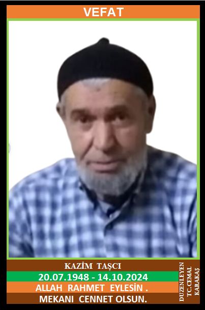 İLÇEMİZ YORTAN BELDESİ DERE MAHALLE NÜFUSUNA KAYITLI OLUP, YORTN BELDESİ DERE MAHLLE HASİNLER KÜME EVLERİ NO:6/A’DA İKAMET EDEN MERHUM İSMAİL ve MERHUME FATİME OĞLU, MERHUME ZEHRA TAŞCI EŞİ, KAZİM TAŞCI (20.07.1948 DOĞUMLU) HAKKIN RAHMETİNE KAVUŞMUŞTUR. CENAZESİ (14.10.2024 PAZARTESİ GÜNÜ) YORTAN BELDESİ MERKEZ MAHLLE KARŞI CAMİİNDE ÖĞLE NAMAZINA MÜTEAKİP KILINACAK CENAZE NAMAZINDAN SONRA SON YOLCULUĞUNA UĞURLANACAKTIR. EŞİ MERHUME ZEHRA TAŞCI, ÇOCUKLARI ABBAS TAŞCI, İSA TAŞCI, İSMAİL TAŞCI, AYNUR TAŞCI, GÜLİZAR TAŞCI, FATMA TAŞCI, ASİYE TAŞCI. ALLAH RAHMET EYLESİN. MEKANI CENNET OLSUN. GERİDE BIRAKTIĞI SEVENLERİNE VE AİLESİNE BAŞSAĞLIĞI VE SABIR DİLERİZ.