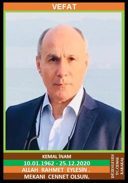 YENİCE DEREBAŞI KÖYÜ İMAMKÖY MAHALLESİ NÜFUSUNA KAYITLI OLUP, KARABÜK İLİ SAFRANBOLU İLÇESİNDE İKAMET EDEN MERHUM DURMUŞ ve HURİYE OĞLU, MAKBULE İNAM EŞİ, KARABÜK 3 NİSAN MERKEZ KARAKOLU EMNİYET PERSONELİ MEMURU KEMAL İNAM (10.01.162 DOĞUMLU) HAKKIN RAHMETİNE KAVUŞMUŞTUR. CENAZESİ (25.12.2020 CUMA GÜNÜ) YENİCE DEREBAŞI KÖYÜ İMAMKÖY MAHALLESİ CAMİİNDE SAAT:11.30’DA KILINACAK CENAZE NAMAZINDAN SONRA SON YOLCULUĞUNA UĞURLANACAKTIR. ANNESİ HURİYE İNAM, EŞİ MAKBULE İNAM, ÇOCUKLARI CİHAN İNAM, BETÜL ÇELİKLER, DAMADI FATİH ÇELİKLER, KARDEŞLERİ CELAL İNAM, CEMAL İNAM, YEĞENLERİ FURKAN İNAM, BARIŞ İNAM, YASİNCAN İNAM. ALLAH RAHMET EYLESİN. MEKANI CENNET OLSUN. GERİDE BIRAKTIĞI SEVENLERİNE VE AİLESİNE BAŞSAĞLIĞI VE SABIR DİLERİZ.