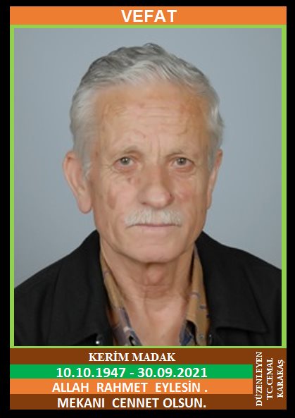 YENİCE GÜNEY KÖYÜ NÜFUSUNA KAYITLI OLUP, YENİCE FATİH MAHALLESİ YILDIZ SOKAK NO:10/2’DE İKAMET EDEN MERHUM MEHMET ve MERHUME DURKADIN OĞLU, MERHUME KEZBAN MADAK EŞİ, YENİCE DENİZ ECZANESİ ÇALIŞANI RAMAZAN MADAK’IN BABASI, YENİCE YORÜS EMEKLİSİ KERİM MADAK (10.10.1947 DOĞUMLU) HAKKIN RAHMETİNE KAVUŞMUŞTUR. CENAZESİ (30.09.2021 PERŞEMBE GÜNÜ) YENİCE MERKEZ CAMİİNDE ÖĞLE NAMAZINA MÜTEAKİP KILINACAK CENAZE NAMAZINDAN SONRA SON YOLCULUĞUNA UĞURLANACAKTIR. EŞİ MERHUME KEZBAN MADAK, ÇOCUKLARI RAMAZAN MADAK, ELVAN TEFENLİ, DAMADI MERHUM KADİR TEFENLİ. ALLAH RAHMET EYLESİN. MEKANI CENNET OLSUN. GERİDE BIRAKTIĞI SEVENLERİNE VE AİLESİNE BAŞSAĞLIĞI VE SABIR DİLERİZ.