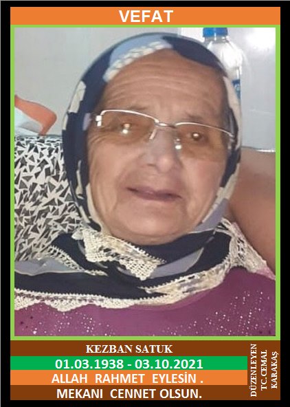 YENİCE SATUK KÖYÜ NÜFUSUNA KAYITLI OLUP, SATUK KÖYÜ UZUMKUM MEVKİ NO:3/4’DE İKAMET EDEN MERHUM TEVFİK ve MERHUME KEZBAN KIZI, MERHUM KADİR SATUK EŞİ, KEZBAN SATUK (01.03.1938 DOĞUMLU) HAKKIN RAHMETİNE KAVUŞMUŞTUR. CENAZESİ (03.10.2021 PAZAR GÜNÜ) SATUK KÖYÜ UZUMKUM MAHALLESİ CAMİİNDE ÖĞLE NAMAZINA MÜTEAKİP KILINACAK CENAZE NAMAZINDAN SONRA SON YOLCULUĞUNA UĞURLANACAKTIR. EŞİ MERHUM KADİR SATUK, ÇOCUKLARI MEHMET SATUK, OSMAN SATUK, FATMA DERELİ, DAMADI ZEKİ DERELİ, TORUNU KARABÜK EĞİTİM ARAŞTIRMA HASTANESİ SEKRETERİ ZEKİ SATUK. ALLAH RAHMET EYLESİN. MEKANI CENNET OLSUN. GERİDE BIRAKTIĞI SEVENLERİNE VE AİLESİNE BAŞSAĞLIĞI VE SABIR DİLERİZ.