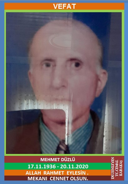 YENİCE ATATÜRK MAHALLESİ NÜFUSUNA KAYITLI OLUP, ATATÜRK MAHALLESİ ÇAYLI SOKAK NO:18’DE İKAMET MERHUM İBRAHİM ve MERHUME HANİFE OĞLU, MEHMET DÜZLÜ (17.11.1936 DOĞUMLU) HAKKIN RAHMETİNE KAVUŞMUŞTUR. CENAZESİ (21.11.2020 CUMARTESİ GÜNÜ) ATATÜRK MAHALLESİ MERKEZ CAMİİNDE KILINACAK CENAZE NAMAZINDAN SONRA SON YOLCULUĞUNA UĞURLANACAKTIR. KARDEŞİ SATILMIŞ DÜZLÜ, YEĞENLERİ MERHUM ZABITA ŞERAFETTİN DÜZLÜ, İBRAHİM DÜZLÜ, BURHAN DÜZLÜ, HANİFE ÇAYLIOĞLU, GÜLSÜN ÇAYLIOĞLU, GÜLSEREN ŞIK. ALLAH RAHMET EYLESİN. MEKANI CENNET OLSUN. GERİDE BIRAKTIĞI SEVENLERİNE VE AİLESİNE BAŞSAĞLIĞI VE SABIR DİLERİZ.
