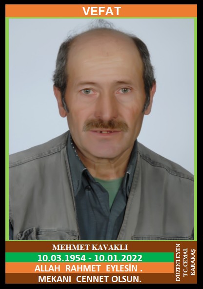 YENİCE ÇELTİK KÖYÜ SERDENGEÇLER MAHALLESİ NÜFUSUNA KAYITLI OLUP, YENİCE ÖZAL MAHALLESİ ATASOY CADDESİ NO:2/1’DE İKAMET EDEN MERHUM HALİL ve MERHUME DÖNDÜ OĞLU, BEHİCE KAVAKLI EŞİ, MADEN EMEKLİSİ MEHMET KAVAKLI (10.03.1954 DOĞUMLU) HAKKIN RAHMETİNE KAVUŞMUŞTUR. CENAZESİ (11.01.2022 SALI GÜNÜ) ÖZAL MAHALLESİ CAMİİNDE ÖĞLE NAMAZINA MÜTEAKİP KILINACAK  CENAZE NAMAZINDAN SONRA SON YOLCULUĞUNA UĞURLANACAKTIR. EŞİ BEHİCE KAVAKLI, ÇOCUKLARI MUHAMMET KAVAKLI, HKAN KAVAKLI, SEVGİ KAVAKLI, DERYA KAVAKLI. ALLAH RAHMET EYLESİN. MEKANI CENNET OLSUN. GERİDE BIRAKTIĞI SEVENLERİNE VE AİLESİNE BAŞSAĞLIĞI VE SABIR DİLERİZ.