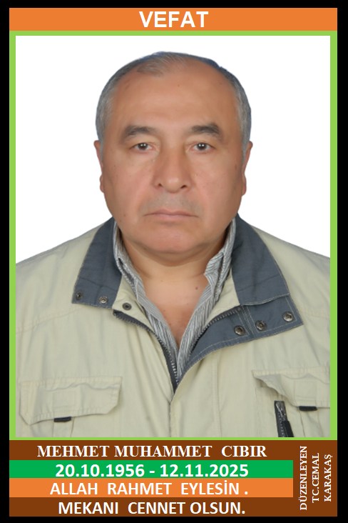 İLÇEMİZ BAĞBAŞI KÖYÜ NÜFUSUNA KAYITLI OLUP, ALMANYA GELSENKİRCHEN’DE İKAMET EDEN MERHUM NURİ ve MERHUME KEZBAN OĞLU, MERHUME NEDİFE CIBIR EŞİ ALMANYA EMEKLİSİ MEHMET (MUHAMMET) CIBIR (20.10.1956 DOĞUMLU) HAKKIN RAHMETİNE KAVUŞMUŞTUR. CENAZESİ (15.11.2025 CUMARTESİ GÜNÜ) ÖZAL MAHALLESİ CAMİİNDE İKİNDİ NAMAZINA MÜTEAKİP KILINACAK CENAZE NAMAZINDAN SONRA SON YOLCULUĞUNA UĞURLANACAKTIR. EŞİ MERHUME NEDİFE CIBIR, ÇOCUKLARI MESUT CIBIR, MÜJDAT CIBIR, MURAT CIBIR, NİLGÜL CIBIR. ALLAH RAHMET EYLESİN. MEKANI CENNET OLSUN. GERİDE BIRAKTIĞI SEVENLERİNE VE AİLESİNE BAŞSAĞLIĞI VE SABIR DİLERİZ.