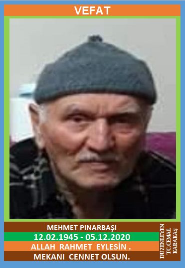 YENİCE HÜSEYİNBEYOĞLU KÖYÜ NÜFUSUNA KAYITLI OLUP, YENİCE KADIKÖY AHATLAR KÜME EVLERİ NO:11’DE İKAMET EDEN MERHUM HALİL ve MERHUME KEZBAN OĞLU, ASİYE PINARBAŞI EŞİ, TAVUK DÖNERCİSİ MURAT PINARBAŞI BABASI, (12.02.1945 DOĞUMLU) HAKKIN RAHMETİNE KAVUŞMUŞTUR. CENAZESİ (05.12.2020 CUMARTESİ GÜNÜ) YENİCE HÜSEYİNBEYOĞLU MERKEZ CAMİİNDE SAAT: 12.30’DA KILINACAK CENAZE NAMAZINDAN SONRA SON YOLCULUĞUNA UĞURLANACAKTIR. EŞİ ASİYE PINARBAŞI, ÇOCUKLARI MURAT PINARBAŞI, SUAT PINARBAŞI, BURAK MUHAMMET PINARBAŞI, KARDEŞLERİ MERHUM NURİ PINARBAŞI, MUHİTTİN PINARBAŞI, MERHUM İZZET PINARBAŞI, MERHUM HÜSNÜ PINARBAŞI, FATMA AKKÜTÜK. ALLAH RAHMET EYLESİN. MEKANI CENNET OLSUN. GERİDE BIRAKTIĞI SEVENLERİNE VE AİLESİNE BAŞSAĞLIĞI VE SABIR DİLERİZ.
