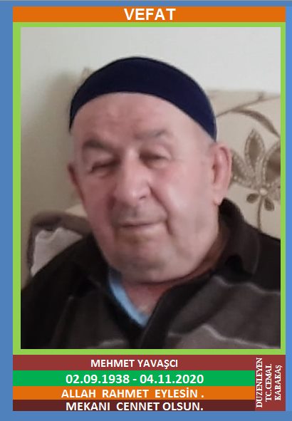 YENİCE YORTAN DÖNGELLER MAHALLESİ NÜFUSUNA KAYITLI OLUP, YORTAN DERE MAHALLESİ ŞEYHOĞLU KÜME EVLERİ NO:35’DE İKAMET EDEN MERHUM AHMET HAMDİ ve MERYEM OĞLU, ZEYNEP YAVAŞCI EŞİ, MEHMET YAVAŞCI (02.09.1938 DOĞUMLU) HAKKIN RAHMETİNE KAVUŞMUŞTUR. CENAZESİ (04.11.2020 ÇARŞAMBA GÜNÜ) YORTAN MERKEZ YENİ CAMİDE SAAT: 11.30’DA KILINACAK CENAZE NAMAZINDAN SONRA SON YOLCULUĞUNA UĞURLANACAKTIR. EŞİ ZEYNEP YAVAŞCI, ÇOCUKLARI HAMZA YAVAŞCI, NEVZAT YAVAŞCI, KARDEŞLERİ HASAN YAVAŞCI, MERHUM ŞEVKİ YAVAŞCI, İSMAİL YAVAŞCI, MUSTAFA YAVAŞCI. ALLAH RAHMET EYLESİN. MEKANI CENNET OLSUN. GERİDE BIRAKTIĞI SEVENLERİNE VE AİLESİNE BAŞSAĞLIĞI VE SABIR DİLERİZ.