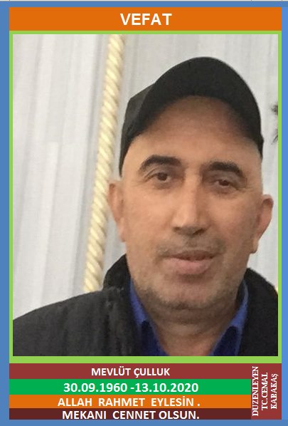 YENİCE BAĞBAŞI KÖYÜ DABAZLAR MAHALLESİ NÜFUSUNA KAYITLI OLUP, ÇELTİK KÖYÜ DERE KÜME EVLERİ NO:7’DE İKAMET EDEN İZZET ve FATİME OĞLU, YILDIZ ÇULLUK EŞİ, ÇETE LAKABI İLE BİLİNEN MADEN EMEKLİSİ MEVLÜT ÇULLUK (30.09.1960 DOĞUMLU) HAKKIN RAHMETİNE KAVUŞMUŞTUR. CENAZESİ  (13.10.2020 SALI GÜNÜ) BAĞBAŞI KÖYÜ DABAZLAR MAHALLESİ MERKEZ CAMİİNDE SAAT: 14.00’DA KILINACAK CENAZE NAMAZINDAN SONRA SON YOLCULUĞUNA UĞURLANACAKTIR. EŞİ YLDIZ ÇULLUK, ÇOCUKLARI, ÜMİT ÇULLUK, SEVGİ AKGÜN, SEVİL TURGUT, DAMATLARI OSMAN AKGÜN, BURAK TURGUT. ALLAH RAHMET EYLESİN. MEKANI CENNET OLSUN. GERİDE BIRAKTIĞI SEVENLERİNE VE AİLESİNE BAŞSAĞLIĞI VE SABIR DİLERİZ.