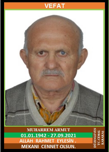 YENİCE NADULLAR KÖYÜ NÜFUSUNA KAYITLI OLUP, YENİCE YORTAN MERKEZ MAHALLESİ FATİH CADDESİ NO: 75/1’DE İKAMET EDEN MERHUM HÜSEYİN ve MERHUME AYŞE OĞLU, MERHUME ZEYNEP ARMUT EŞİ, MUHARREM ARMUT (01.01.1942 DOĞUMLU) HAKKIN RAHMETİNE KAVUŞMUŞTUR. CENAZESİ (28.09.2021 SALI GÜNÜ) YORTAN MERKEZ CAMİİNDE ÖĞLE NAMAZINA MÜTEAKİP KILINACAK CENAZE NAMAZINDAN SONRA SON YOLCULUĞUNA UĞURLANACAKTIR. EŞİ MERHUME ZEYNEP ARMUT, ÇOCUKLARI YAŞAR ARMUT, ERMAN ARMUT. ALLAH RAHMET EYLESİN. MEKANI CENNET OLSUN. GERİDE BIRAKTIĞI SEVENLERİNE VE AİLESİNE BAŞSAĞLIĞI VE SABIR DİLERİZ.