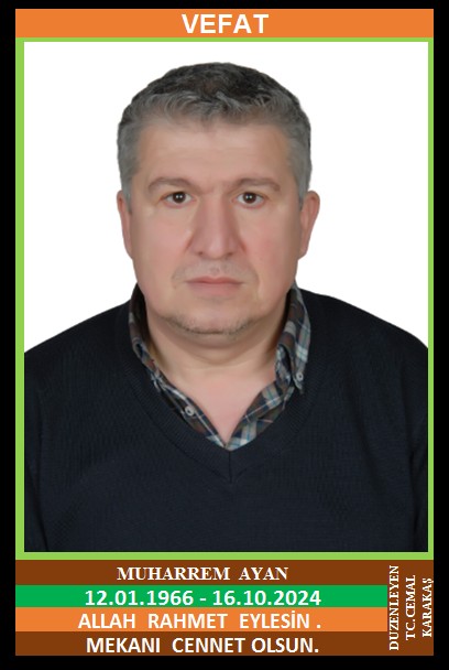 İLÇEMİZ TIR KÖYÜ CAMİYANI MAHALLESİ NÜFUSUNA KAYITLI OLUP, TIR KÖYÜ CAMİYANI KÜME EVLERİ NO: 100/A’DA İKAMET EDEN MERHUM MÜKERREM ve AZİZE OĞLU, HANİFE AYAN EŞİ, YENİCE ESNAFLARINDAN AYAN MARKET SAHİBİ MUHARREM AYAN (12.01.1966 DOĞUMLU) HAKKIN RAHMETİNE KAVUŞMUŞTUR. CENAZESİ (17.10.2024 PERŞEMBE GÜNÜ) YENİCE MERKEZ CAMİİNDE ÖĞLE NAMAZINA MÜTEAKİP KILINACAK CENAZE NAMAZINDAN SONRA SON YOLCULUĞUNA UĞURLANACAKTIR. KAYIN BABASI AHMET MADAK, KAYINVALİDESİ FATMA MADAK, ANNESİ AZİZE AYAN, EŞİ HANİFE AYAN, ÇOCUKLARI YASİN AYAN, ALİCAN AYAN, DUYGU AYAN BAYBUK, DAMADI RAMAZAN BAYBUK, KARDEŞLERİ SAFİYE ONAT, SEVİM ODABAŞ, EMİNE KÖK, SATI ONAN, ENİŞTELERİ YILDIRAY ODABAŞ, CENGİZ ONAN, HİLMİ ONAT, ERKAN KÖK. ALLAH RAHMET EYLESİN. MEKANI CENNET OLSUN. GERİDE BIRAKTIĞI SEVENLERİNE VE AİLESİNE BAŞSAĞLIĞI VE SABIR DİLERİZ.