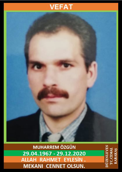YENİCE HİSAR KÖYÜ NÜFUSUNA KAYITLI OLUP, KOCAELİ İLİ İZMİT İLÇESİNDE İKAMET EDEN MERHUM TAHSİN ve MERHUME HANİFE OĞLU, AYNUR ÖZGÜN EŞİ, MUHARREM ÖZGÜN (29.04.1967 DOĞUMLU) HAKKIN RAHMETİNE KAVUŞMUŞTUR. CENAZESİ (29.12.2020 SALI GÜNÜ) YENİCE MERKEZ CAMİİNDE KILINACAK CENAZE NAMAZINDAN SONRA SON YOLCULUĞUNA UĞURLANACAKTIR. EŞİ AYNUR ÖZGÜN, ÇOCUKLARI SEZAİ ÖZGÜN, SEZER ÖZGÜN, KARDEŞLERİ MURAT ÖZGÜN, İBRAHİM ÖZGÜN. ALLAH RAHMET EYLESİN. MEKANI CENNET OLSUN. GERİDE BIRAKTIĞI SEVENLERİNE VE AİLESİNE BAŞSAĞLIĞI VE SABIR DİLERİZ.