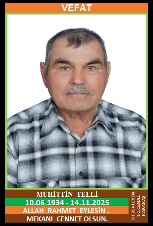 İLÇEMİZ MENDERES MAHALLESİ NÜFUSUNA KAYITLI OLUP,  MENDERES MAHALLESİ OSMANBEYLER KÜME EVLERİ NO:19/2 ve İSMETPAŞA MAHALLESİ BEYAZIT SOKAK NO: 8’DE İKAMET EDEN MERHUM TEVFİK ve MERHUME ZELİHA OĞLU, MERHUME İHSANE TELLİ EŞİ, MUHİTTİN TELLİ (10.06.1934 DOĞUMLU) HAKKIN RAHMETİNE KAVUŞMUŞTUR. CENAZESİ (15.11.2025 CUMARTESİ GÜNÜ) İSMETPAŞA MAHALLESİ MERKEZ CAMİİNDE ÖĞLE NAMAZINA MÜTEAKİP KILINACAK CENAZE NAMAZINDAN SONRA SON YOLCULUĞUNA UĞURLANACAKTIR. EŞİ MERHUME İHSANE TELLİ ÇOCUKLARI DURSUN TELLİ, YAŞAR TELLİ, GÜLHAN ONUR, ZEKİYE TELLİ, DAMATLARI HAYRETTİN ONUR, NURETTİN TELLİ. ALLAH RAHMET EYLESİN. MEKANI CENNET OLSUN. GERİDE BIRAKTIĞI SEVENLERİNE VE AİLESİNE BAŞSAĞLIĞI VE SABIR DİLERİZ.