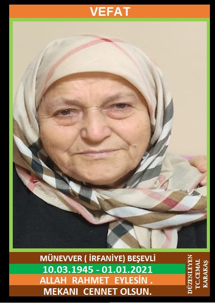 YENİCE GÜNEY KÖYÜ NÜFUSUNA KAYITLI OLUP, YENİCE TIR KÖYÜ YENİ MEVKİ 17’DE İKAMET EDEN MERHUM İBRAHİM ve MERHUME HANİFE KIZI, S.S. GÜNEY KÖYÜ TARIMSAL KALKINDIRMA KOOPERATİFİ BAŞKANI SALİM BEŞEVLİ’NİN YENGESİ, DEVLET HASTANESİ ÇALIŞANI CEMAL BEŞEVLİ VE GENÇ BİLİŞİMİN ORTAĞI ÖMER BEŞEVLİ’NİN ANNESİ, MERHUM SATILMIŞ BEŞEVLİ’NİN EŞİ MÜNEVVER (İRFANİYE ) BEŞEVLİ (10.03.1945 DOĞUMLU) HAKKIN RAHMETİNE KAVUŞMUŞTUR. CENAZESİ (02.01.2021 CUMARTESİ GÜNÜ)YENİCE TIR KÖYÜ KADI DEĞİRMENDÜZÜ CAMİİNDE KILINACAK CENAZE NAMAZINDAN SONRA SON YOLCULUĞUNA UĞURLANACAKTIR. EŞİ MERHUM SATILMIŞ BEŞEVLİ. ÇOCUKLARI CEMAL BEŞEVLİ, KEMAL BEŞEVLİ, ÖMER BEŞEVLİ, KIZLAR DURKADIN ALAGÖZ, DÖNDÜ TATAR, EMİNE ÖREN, HANİFE ONAN, AYNUR (MÜRVET) EREN, RUKİYE ACAR, DAMATLARI MERHUM EROL AÇIKGÖZ, HASAN TATAR, ERGÜN ÖREN, YÜCEL ONAN, KERAMETTİN EREN ZEKERİYE ACAR, KAYINLARI HÜSEYİN BEŞEVLİ, HÜSNÜ BEŞEVLİ, AHMET BEŞEVLİ , SALİM BEŞEVLİ. ALLAH RAHMET EYLESİN. MEKANI CENNET OLSUN. GERİDE BIRAKTIĞI SEVENLERİNE VE AİLESİNE BAŞSAĞLIĞI VE SABIRLAR DİLERİZ.