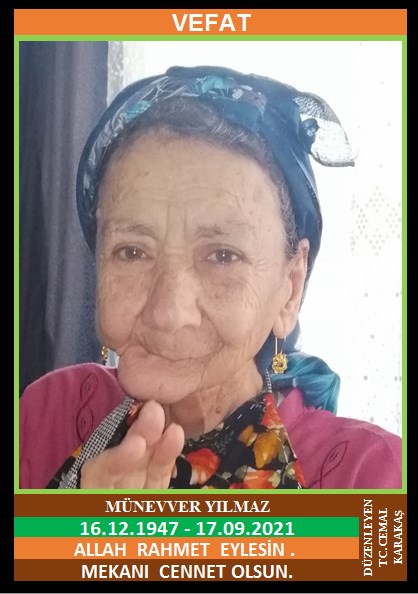 YENİCE İSMETPAŞA MAHALLESİ NÜFUSUNA KAYITLI OLUP, İSMETPAŞA MAHALLESİ KADILAR KÜME EVLERİ NO: 41’DE İKAMET EDEN MERHUM TAHİR ve MERHUME FATİME KIZI, MERHUM KISA LAKABI İLE BİLİNEN MEHMET YILMAZ EŞİ, (16.12.1947 DOĞUMLU) HAKKIN RAHMETİNE KAVUŞMUŞTUR. CENAZESİ (18.09.2021 CUMARTESİ GÜNÜ) İSMETPAŞA MAHALLESİ HACIARPALIK CAMİİNDE ÖĞLE NAMAZINA MÜTEAKİP KILINACAK CENAZE NAMAZINDAN SONRA SON YOLCULUĞUNA UĞURLANACAKTIR. EŞİ MERHUM MEHMET YILMAZ, ÇOCUKLARI OLGUN YILMAZ, MURAT YILMAZ, KARDEŞLERİ KENAN TOPRAK, AHMET TOPRAK. ALLAH RAHMET EYLESİN. MEKANI CENNET OLSUN. GERİDE BIRAKTIĞI SEVENLERİNE VE AİLESİNE BAŞSAĞLIĞI VE SABIR DİLERİZ.