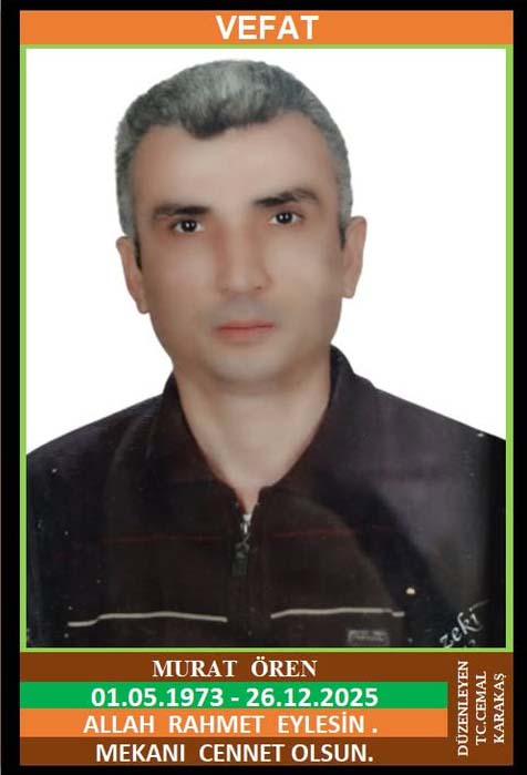 İLÇEMİZ HİSAR KÖYÜ NÜFUSUNA KAYITLI OLUP, İSTANBUL İLİNDE İKAMET EDEN OSMAN ve AYŞE OĞLU, AYSEL ÖREN EŞİ, İSTANBUL DA ESNAFLIK YAPAN EMEKLİ MURAT ÖREN (01.05.1973 DOĞUMLU) HAKKIN RAHMETİNE KAVUŞMUŞTUR. CENAZESİ (27.12.2025 CUMARTESİ GÜNÜ) YENİCE YEŞİL CAMİDE ÖĞLE NAMAZINA MÜTEAKİP KILINACAK CENAZE NAMAZINDAN SONRA SON YOLCULUĞUNA UĞURLANACAKTIR. BABASI OSMAN ÖREN, ANNESİ AYŞE ÖREN, KAYINPEDERİ MERHUM HÜSEYİN ÖREN, KAYINVALİDESİ BAHRİYE ÖREN, EŞİ AYSEL ÖREN, ÇOCUĞU BERAT ÖREN, KARDEŞLERİ SEYFETTİN ÖREN, BİRCAN ÖREN, GÜRCAN ÖREN, FERİCAN ÖREN, NURGÜL BAŞAK, ENİŞTELERİ YÜKSEL ÖREN, ŞENDOĞAN KASKATI, DAVUT BAŞAK, BACANAĞI ERTUĞRUL CEBECİK. ALLAH RAHMET EYLESİN. MEKANI CENNET OLSUN. GERİDE BIRAKTIĞI SEVENLERİNE VE AİLESİNE BAŞSAĞLIĞI VE SABIR DİLERİZ.