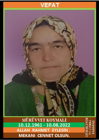 YENİCE BAĞBAŞI KÖYÜ NÜFUSUNA KAYITLI OLUP, BAĞBAŞI KÖYÜ KOCAOĞLU MEVKİ NO:52/1’DE İKAMET EDEN MERHUM ALİ ve MERHUME NAZİFE KIZI, MERHUM HASAN KOYMALI EŞİ, MÜRÜVVET KOYMALI (10.12.1961 DOĞUMLU) HAKKIN RAHMETİNE KAVUŞMUŞTUR. CENAZESİ (11.08.2022 PERŞEMBE GÜNÜ) ÖZAL MAHALLESİ CAMİİDE ÖĞLE NAMAZINA MÜTEAKİP KILINACAK CENAZE NAMAZINDAN SONRA SON YOLCULUĞUNA UĞURLANACAKTIR. EŞİ MERHUM HASAN KOYMALI, ÇOCUKLARI YELİZ TOPRAKLI, DENİZ EYİ, DAMATLARI MURAT TOPRAKLI, ALİ EYİ, KARDEŞLERİ SATILMIŞ ONUR, HASAN ONUR, NAZİFE OKTAY, DURKADIN DORUK. ALLAH RAHMET EYLESİN. MEKANI CENNET OLSUN. GERİDE BIRAKTIĞI SEVENLERİNE VE AİLESİNE BAŞSAĞLIĞI VE SABIR DİLERİZ.