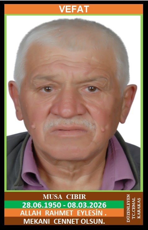 İLÇEMİZ BAĞBAŞI KÖYÜ NÜFUSUNA KAYITLI OLUP, ÖZAL MAHALLESİ ATASOY CADDESİ NO:2/1-7 ve BAĞBAŞI KÖYÜ YENİ KOCAOĞLU MEVKİ NO:61’DE İKAMET EDEN MERHUM MUSTAFA ve MERHUME FATİME OĞLU, RABİA CIBIR EŞİ, MOBİLYACI ESNAFI MUSTAFA CIBIR, BAĞBAŞI ESKİ MUHTARI SEYFİ CIBIR, KARABÜK BELEDİYESİ ZABITA MEMURU SEYFETTİN CIBIR’IN BABASI, MUSA CIBIR (28.06.1950 DOĞUMLU) HAKKIN RAHMETİNE KAVUŞMUŞTUR. CENAZE (09.03.2026 PAZARTESİ GÜNÜ) ÖZAL MAHALLESİ MERKEZ CAMİİNDE ÖĞLE NAMAZINA MÜTEAKİP KILINACAK CENAZE NAMAZINDAN SONRA SON YOLCULUĞUNA UĞURLANACAKTIR. EŞİ RABİA CIBIR, ÇOCUKLARI MUSTAFA, SEYFİ, SEYFETTİN CIBIR, FATMA ÇALIKBAŞI, DİLEK CIBIR, DAMATLARI YILMAZ ÇALIKBAŞI, MÜJDAT CIBIR. ALLAH RAHMET EYLESİN. MEKANI CENNET OLSUN. GERİDE BIRAKTIĞI SEVENLERİNE VE AİLESİNE BAŞSAĞLIĞI VE SABIR DİLERİZ.