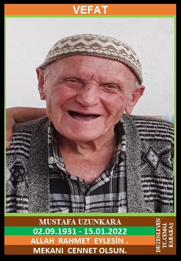 YENİCE İSMETPAŞA MAHALLESİ NÜFUSUNA KAYITLI OLUP, İSMETPAŞA MAHALLESİ DEPO SOKAK NO : 11/1’DE İKAMET EDEN MERHUM MUSTAFA ve MERHUME RABİA OĞLU, MERHUME HANİFE UZUNKARA EŞİ, MICIK LAKABI İLE BİLİNEN MUSTAFA UZUNKARA (02.09.1931 DOĞUMLU) HAKKIN RAHMETİNE KAVUŞMUŞTUR. CENAZESİ (16.01.2022 PAZAR GÜNÜ) İSMETPAŞA MAHALLESİ AŞAĞIDÜZ CAMİİNDE ÖĞLE NAMAZINA MÜTEAKİP KILINACAK CENAZE NAMAZINDAN SONRA SON YOLCULUĞUNA UĞURLANACAKTIR. EŞİ MERHUME HANİFE UZUNKARA, ÇOCUKLARI METİN UZUNKARA, ÇETİN UZUNKARA, KADİR UZUNKARA, YILMAZ UZUNKARA, MÜRVET DERELİ, GÜLSÜM ERDEM , DAMATLARI ALİ DURAN DERELİ, İSMAİL ERDEM. ALLAH RAHMET EYLESİN. MEKANI CENNET OLSUN. GERİDE BIRAKTIĞI SEVENLERİNE VE AİLESİNE BAŞSAĞLIĞI VE SABIR DİLERİZ.
