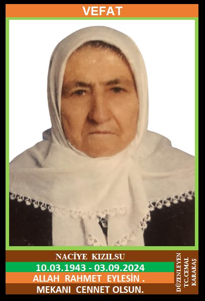 İLÇEMİZ DEREBAŞI KÖYÜ KÜRTLER MAHALLESİ NÜFUSUNA KAYITLI OLUP, KALAYCILAR MAHALLESİ MEHMET BEŞEVLİ CADDESİ NO: 81 B/7’DE İKAMET EDEN MERHUM ALİ ve MERHUME HANİF KIZI, AKCİĞER LAKAPLI MERHUM İBRAHİM KIZILSU EŞİ, NACİYE KIZILSU (10.03.1943 DOĞUMLU) HAKKIN RAHMETİNE KAVUŞMUŞTUR. CENAZESİ (04.09.2024 ÇARŞAMBA GÜNÜ) KALAYCILAR MAHALLESİ MERKEZ CAMİİNDE ÖĞLE NAMAZINA MÜTEAKİP KILINACAK CENAZE NAMAZINDAN SONRA SON YOLCULUĞUNA UĞURLANACAKTIR. EŞİ MERHUM İBRAHİM KIZILSU, ÇOCUKLARI DURKADIN TEPEBAŞI, SAFİYE TEPEBAŞI, SAKİNE İNAM, DAMATLARI KENAN TEPEBAŞI, ŞEVKET TEPEBAŞI, CELAL İNAM. ALLAH RAHMET EYLESİN. MEKANI CENNET OLSUN. GERİDE BIRAKTIĞI SEVENLERİNE VE AİLESİNE BAŞSAĞLIĞI VE SABIR DİLERİZ.