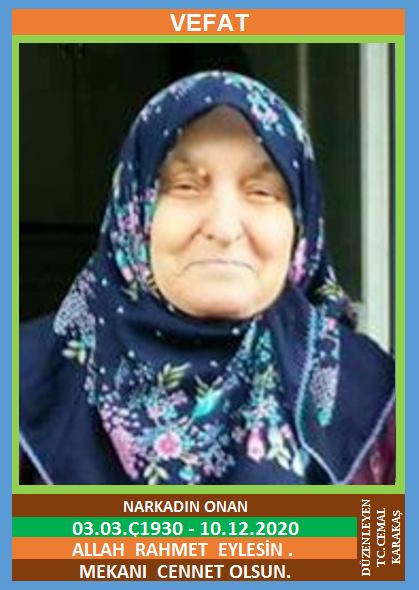 YENİCE GÜNEY KÖYÜ NÜFUSUNA KAYITLI OLUP, YENİCE KALAYCILAR MAHALLESİ İ. MEHMET BEŞEVLİ CADDESİ NO: 81/A/-5’DE İKAMET EDEN MERHUM YAKUP ve AZİZE KIZI, MERHUM MUSTAFA ONAN EŞİ, NARKADIN ONAN (03.03.1930 DOĞUMLU) HAKKIN RAHMETİNE KAVUŞMUŞTUR. CENAZESİ (11.12.2020 CUMA GÜNÜ) YENİCE MERKEZ CAMİİNDE SAAT:11,00’DA KILINACAK CENAZE NAMAZINDAN SONRA SON YOLCULUĞUNA UĞURLANACAKTIR. EŞİ MERHUM MUSTAFA ONAN, ÇOCUKLARI İSMET ONAN, FİKRET ONAN, ŞÜKRÜ ONAN, ERHAN ONAN, MÜRVET OMAK, AYNUR ÇANAKCI, DİLEK NARKADIN ÇAVUŞ, GELİNLERİ NAİLE ONAN, MELAHAT ONAN, NEZİHE ONAN, AYLİN ONAN, DAMATLARI İBRAHİM OMAK, MEHMET ÇAVUŞ, BAHATTİN ÇANAKCI. ALLAH RAHMET EYLESİN. MEKANI CENNET OLSUN. GERİDE BIRAKTIĞI SEVENLERİNE VE AİLESİNE BAŞSAĞLIĞI VE SABIR DİLERİZ.